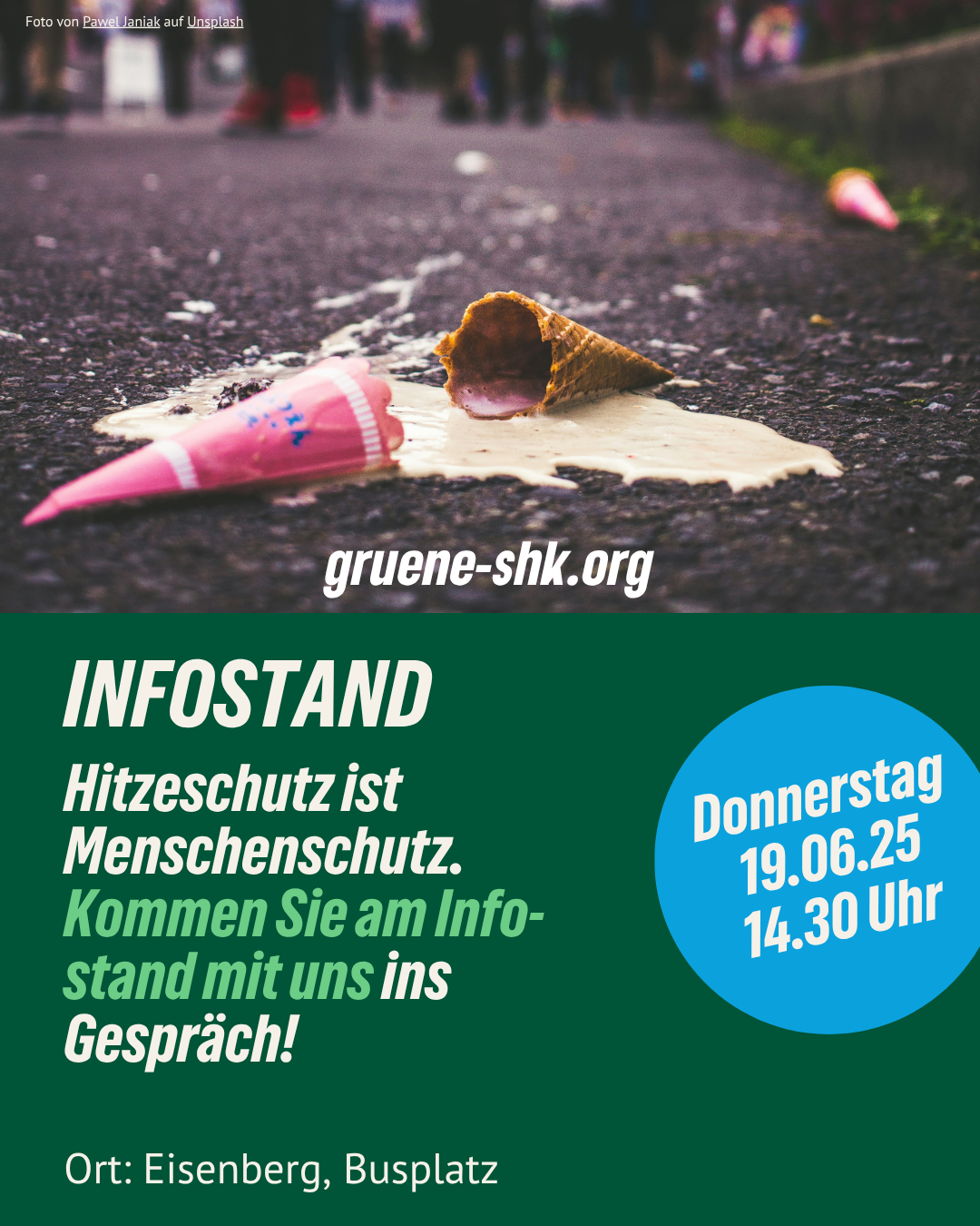 Am 19. Juni 2025 ab 14:30 Uhr lädt BÜNDNIS 90/DIE GRÜNEN Saale-Holzland-Kreis alle interessierten Bürgerinnen und Bürger zu einem Informationsstand auf dem Busplatz in Eisenberg ein. Im Mittelpunkt steht der Austausch über das wichtige Thema Hitzeschutz.
